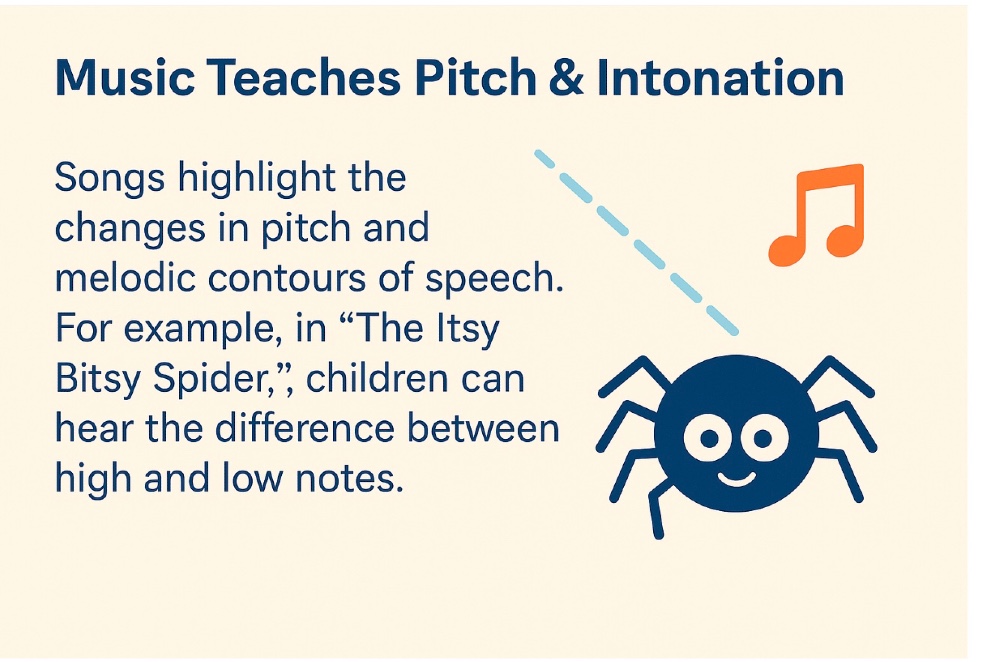 Music helps build a child’s phonological awareness—the ability to hear and play with the sounds of language. Songs with rhythm and rhyme draw attention to syllables, pitch, and word patterns. These are the very skills that form the foundation for speaking, listening, and eventually reading.
