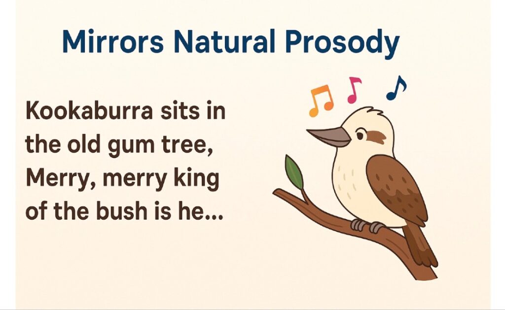 Kookaburra is a great example. It has a steady beat. Natural pauses. And fun stress on words like “laugh” and “merry.”