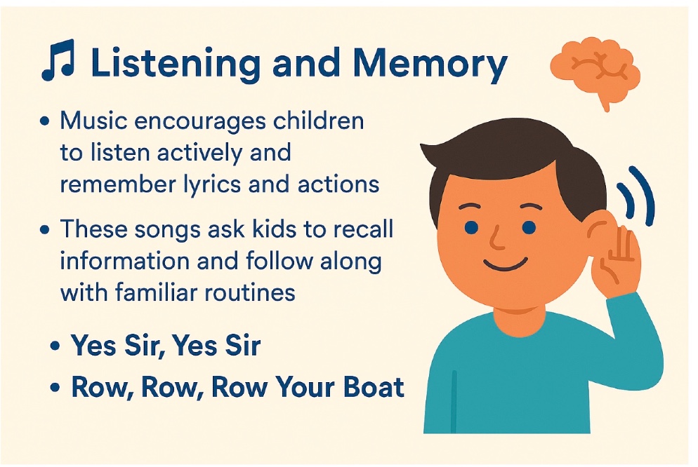 These listening skills transfer to everyday talk. Children who can follow a song can better follow directions. Kids who remember verses develop stronger memory for classroom learning.