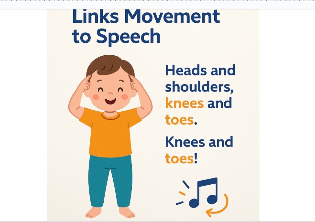 - It gives children a multi-sensory way to connect. They’re hearing the melody, feeling the rhythm, seeing your gestures, and often moving along. That kind of experience helps make language stick.