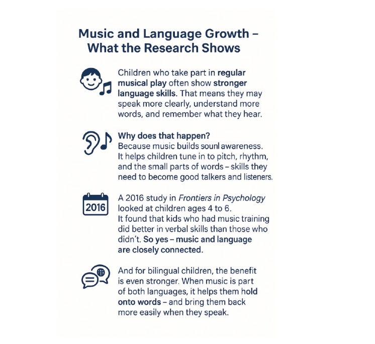 Children who engage in regular musical play often show stronger language development. They tend to speak more clearly, understand a broader range of words, and remember what they hear. But why does music make such a difference?